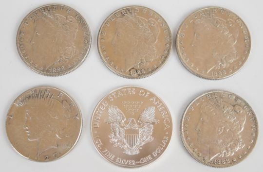 2016 1 ounce silver dollar together with five replica United States of America Morgan and Liberty dollars comprising four 1888 and one 1927, weight of these five 125g