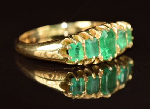 A Victorian 18ct gold ring set with five emerald cut emeralds, Chester 1895, 4.1g, size L