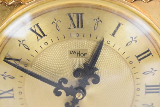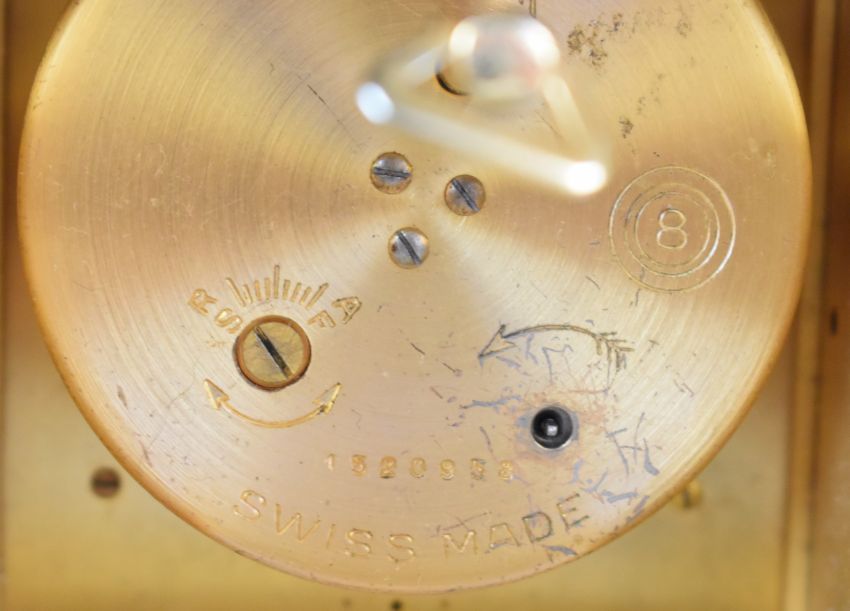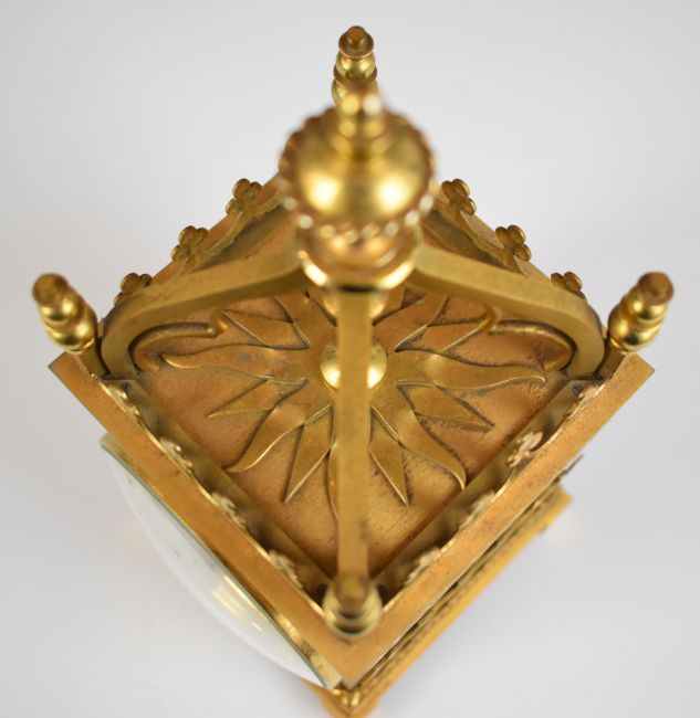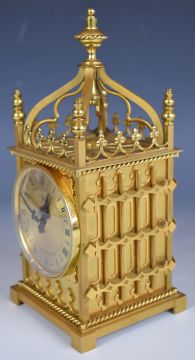 Imhoff Swiss mantel clock of Gothic architectural form, with portcullis design to sides and back and 8 day movement wound via a hinged door to the rear.