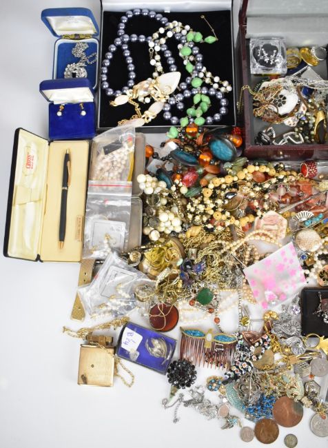 A collection of jewellery including Sarah Coventry, Jewelcraft, Victorian cut steel and vintage brooches, coins, three silver topped scent bottles, silver cased crochet hook, etc