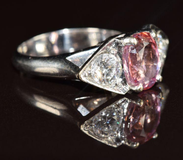 An 18k white gold ring set with a 2.5ct oval cut natural untreated Sri Lankan sapphire and two diamonds of approximately 0.4ct each, with Gem & Pearl Lab certificate, 7.4g, size K