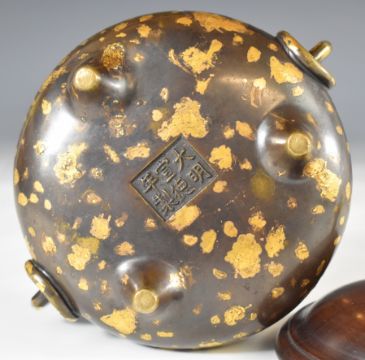 Chinese gold splash bronze tripod censer with twin handles, hardwood cover with carved jade finial and six character mark to base, diameter 14.5cm x height 11.2cm