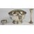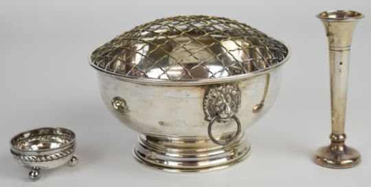 Elizabeth II hallmarked silver rose bowl with twin lion mask and loop handles and silver plated mesh lid, Birmingham 1975, maker W I Broadway & Co, diameter 17cm, together with a Victorian hallmarked silver salt raised on three ball feet and a hallmarked silver trumpet vase, weight of bowl without cover and salt 258g