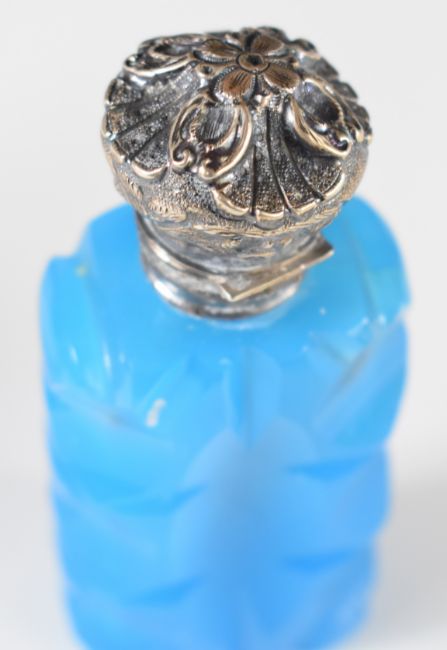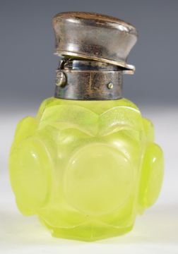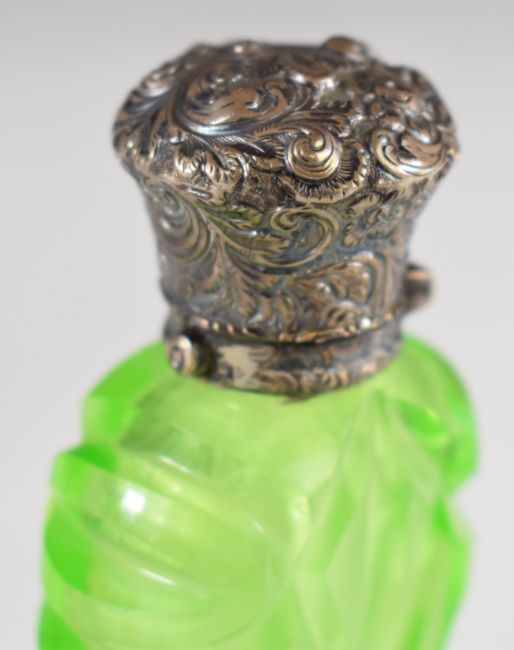 Four 19th / 20thC cut glass scent / perfume bottles, one probably uranium glass, all with hallmarked silver / white metal mounts, tallest 10.5cm