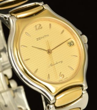 Zenith Academy wristwatch ref. 59-6000-226 with date aperture, gold hands and hour markers, textured gold dial, stainless steel and gold plated case and quartz movement, on bi-metal bracelet, case diameter 33mm, in original box with guarantee card, purchase receipt, related paperwork, spare bracelet link and outer card box.