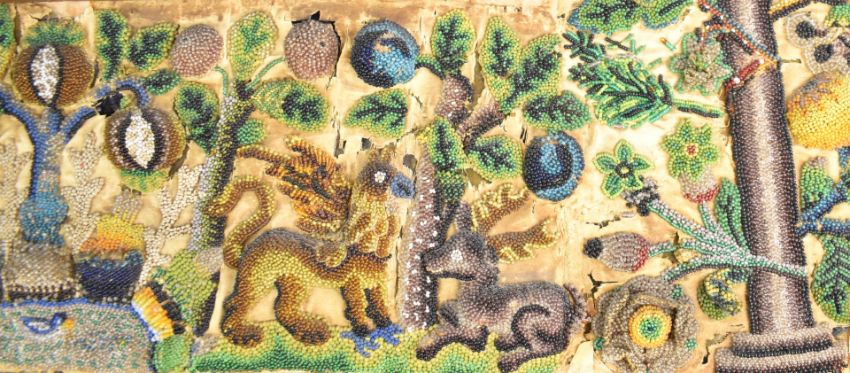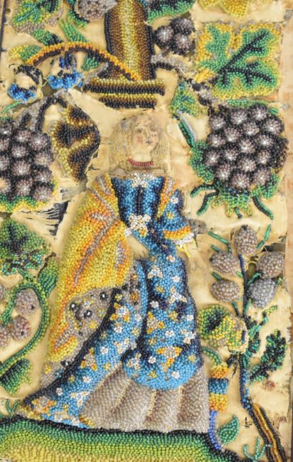 Charles II large beadwork framed mirror depicting the marriage of Charles II and Catherine of Braganza, the two figures raised on tree of life style columns abundant with fruit and foliage above and below the mirror deer, griffins, lion and urns, all worked with coloured beads, bordered by two gilt decorated frames, 87 x 88cm, the mirror 51 x 42cm