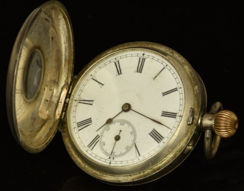 Unnamed hallmarked silver keyless winding half hunter pocket watch with subsidiary seconds dial, blued hands, black Roman numerals, white enamel dial, inlaid blue enamel Roman numerals to the case and unsigned movement, case diameter 47mm, serial number 148669.