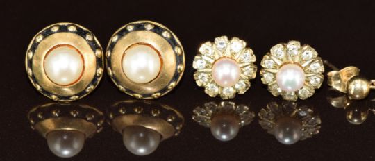 Two pairs of 9ct gold earrings set with pearls (3.7g) and a pair of silver gilt earrings set with pearls