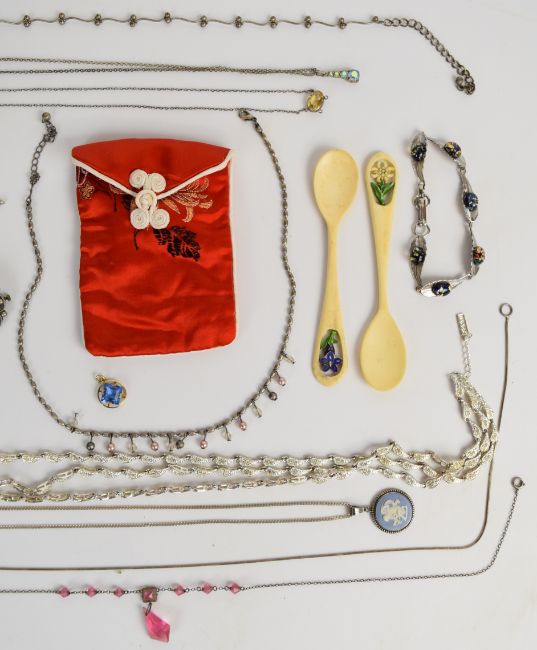 A collection of costume jewellery including Napier necklace, silver Wedgwood pendant, 9ct gold pendant, silver filigree brooch, silver dragonfly brooch, Conway Stewart pen with 14k gold nib, micro mosaic brooch, etc