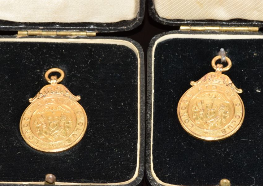 Two cased 1938 London Athletic Club gold medals for Public Schools 100 yards winner and long jump winner, 18.7g