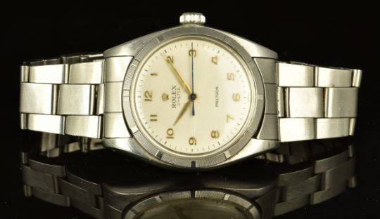 Rolex Oyster Precision gentleman's wristwatch ref. 6427 with gold Arabic numerals, gold and black hands, blued centre seconds hand, cream dial, stainless steel case and signed 17 jewel movement, on stainless steel bracelet, case diameter 35mm, serial number 594592.