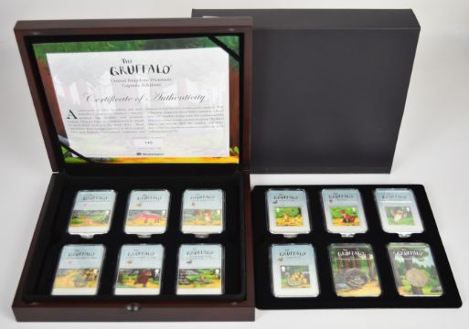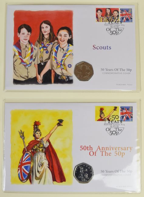 Three Westminster limited edition folders of 50 pence coin covers comprising 50 years of the 50p (11 covers), VE day 75th anniversary (7 covers) and Beatrix Potter (14 covers) together with a further two Beatrix Potter coin covers containing seven 50p coins between them, similar Gruffalo double coin cover and a cased set of Gruffalo coins and stamps (including two 50p coins)