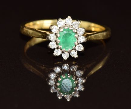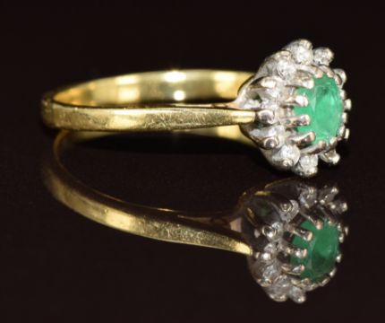 An 18ct gold ring set with an oval cut emerald surrounded by diamonds, 3.2g, size L