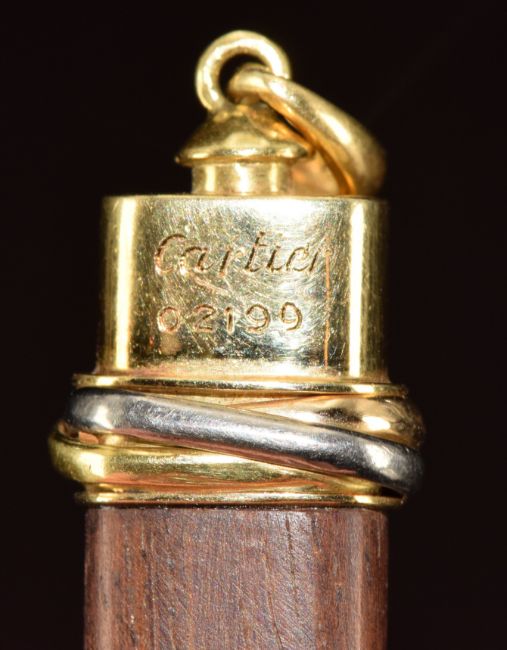 Cartier 'touch wood' pendant, the wooden baton capped with a three-colour trinity band, signed Cartier and numbered 02199, 7.4g, 4.5cm