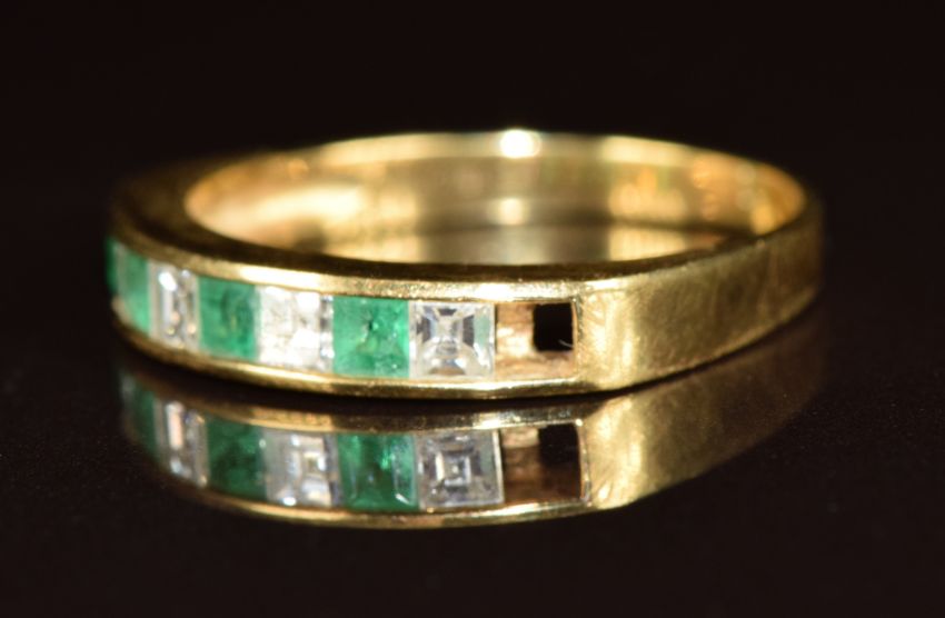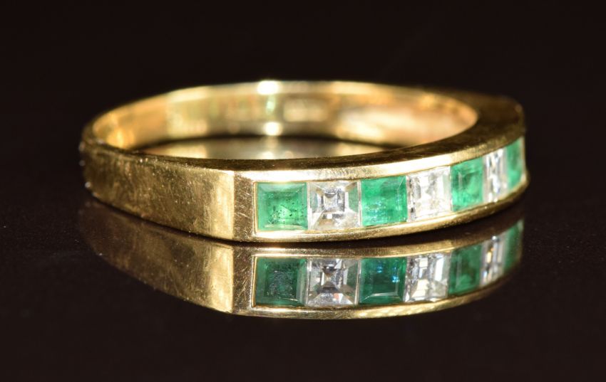 An 18k gold half eternity ring set with alternating square cut emeralds and diamonds, each approximately 0.1ct, 3.6g, size Q