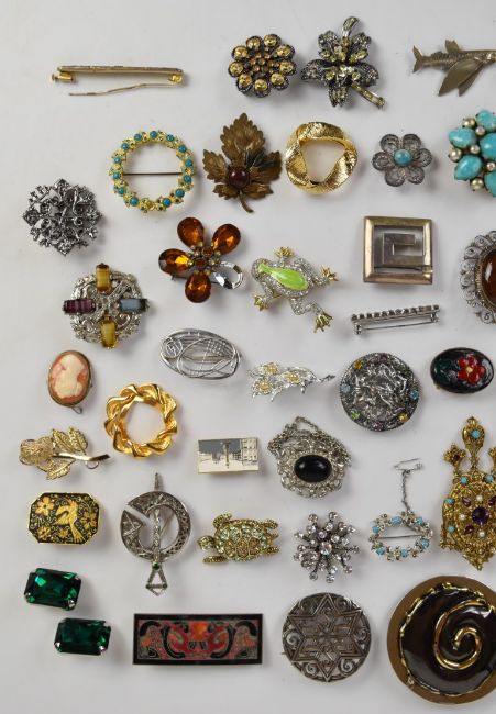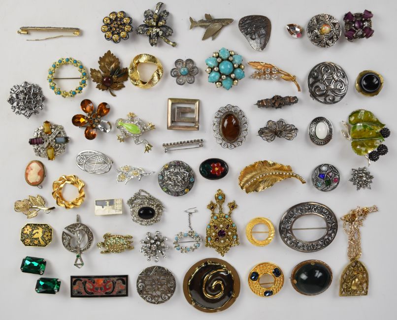 A collection of brooches including Alucraft, two Victorian agate, Exquisite, silver filigree, hallmarked silver, Miracle, silver Mackintosh style, cameo, silver Greek key, Edwardian silver, other silver brooches, etc