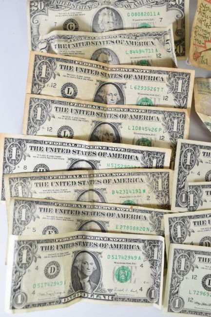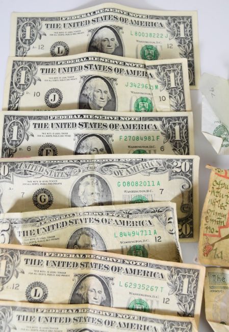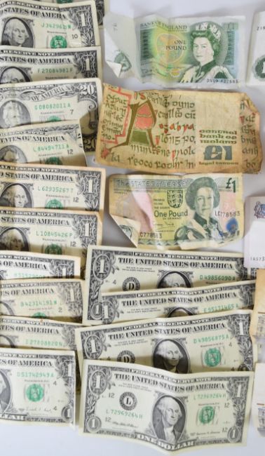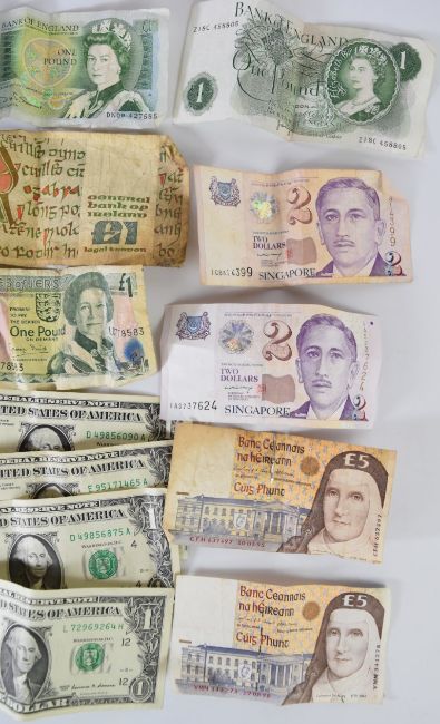 World banknotes comprising United States of America $20, $5 and thirteen $1, two Singapore $2, Jersey £1, Bank of England Somerset and Page £1 and two Bank of Ireland £5 and one £1 example