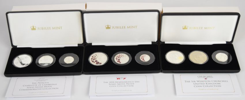 Three Jubilee Mint cased limited edition three coin sets comprising Princess Charlotte of Cambridge and 2018 Remembrance Day proof sets and Winston Churchill set including 2016 £20 fine silver coin, 105g of 0925 silver and 15.7g of 999 silver, all with certificates