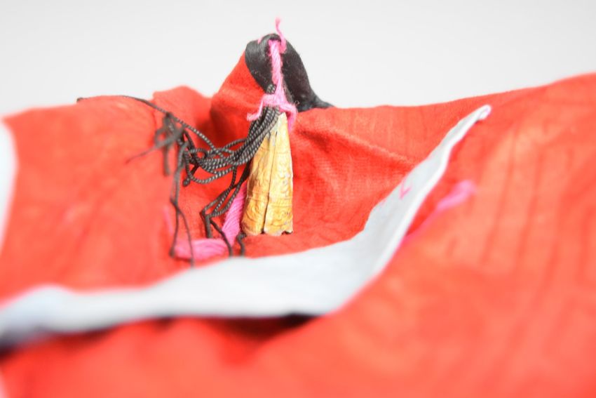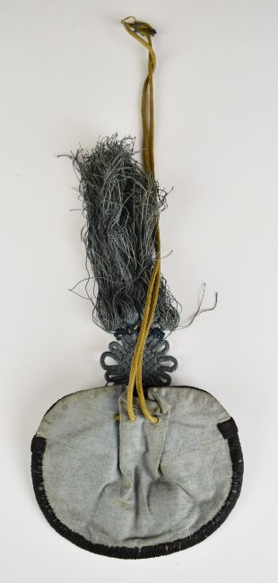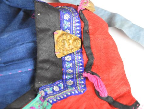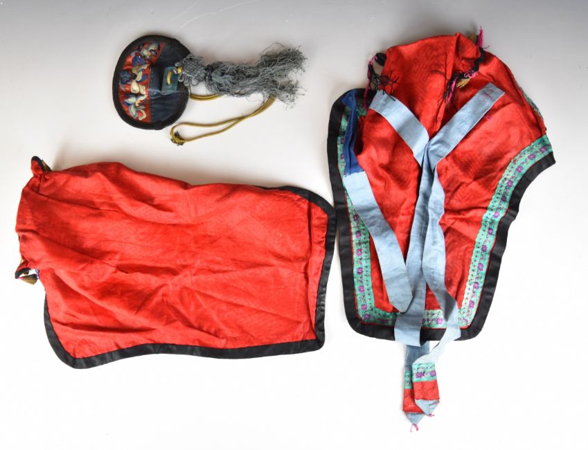 Two Chinese embroidered hats with metal Buddha and bell ornaments, together with an embroidered silk purse, probably late Qing dynasty, W14.5 x H22cm including tassels