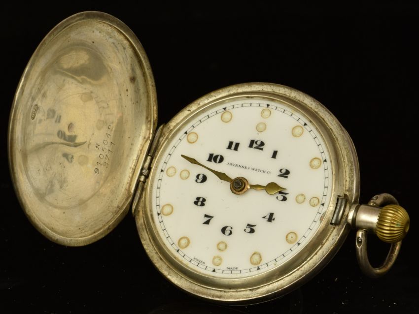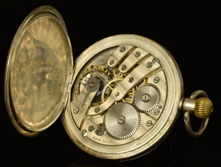 Tavannes Watch Co hallmarked silver keyless winding full hunter braille pocket watch with gold hands, black Arabic numerals, white dial and signed movement, case diameter 50mm, serial number 9105042.