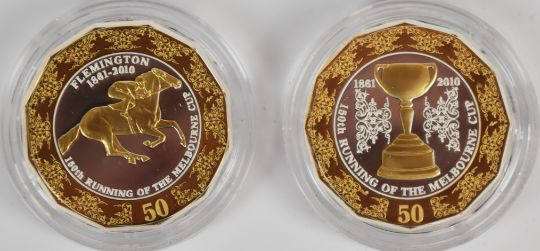 Four Australian limited edition cased proof silver coins comprising 2005 $1 1955 Sydney half sovereign ( 60.5g pure silver), 2010 150th Anniversary of the Running of the Melbourne Cup coin pair, (each 18.24g pure silver) and 2013 1788 The Journey (25g 925 silver), all with certificates