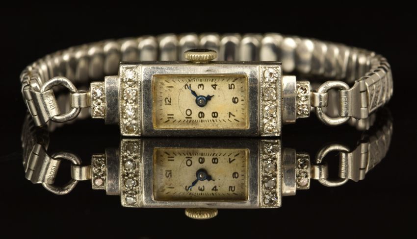 Art Deco platinum ladies wristwatch with diamonds set to the case, blued hands, Arabic numerals, silver dial and mechanical movement, on expanding metal bracelet, case diameter 11mm.