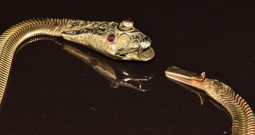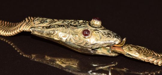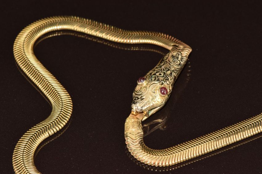 A c1920 yellow metal serpent/ snake necklace set with garnet eyes, 24.2g, 42cm