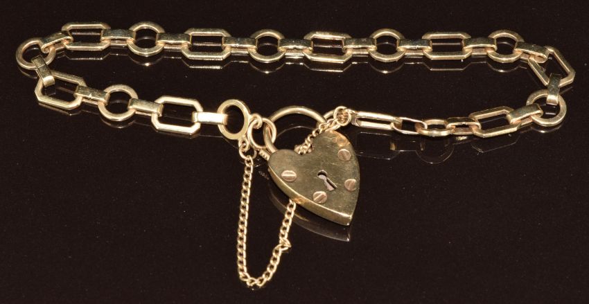 A 9ct gold bracelet with heart padlock clasp, 8.6g, 18cm