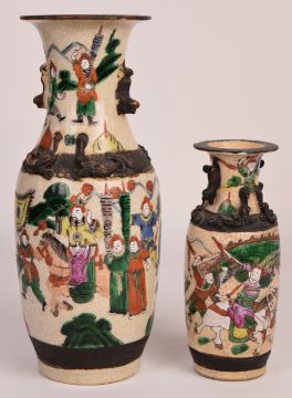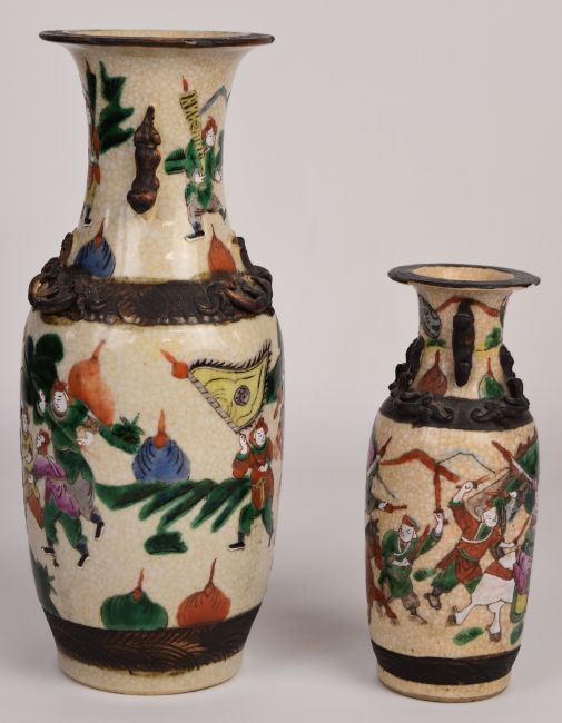 Two Chinese crackle glazed vases with battle / court scene decoration, tallest 30cm