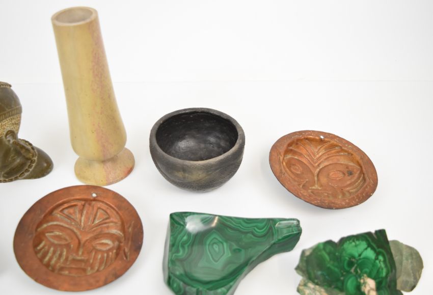 A collection of malachite, agate, soapstone and petrified wood dishes, vase and bust signed Patrick Dambanemwya, Zimbabwe copper dishes, carved African tribal bowl etc., tallest 21cm
