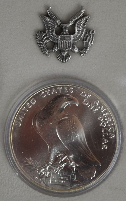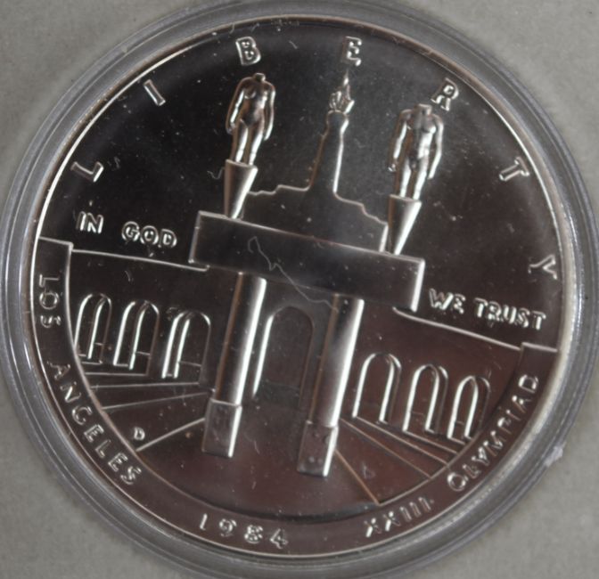 United States silver coins comprising 1998 Liberty 1 ounce silver coin in NGC slab, 1921 Morgan dollar in NGC slab, 1984 coin set including Olympic silver dollar, 2000 proof Library of Congress coin and a 1984 three coin collector's set, comprising one each from the Philadelphia, Denver and San Francisco mints.