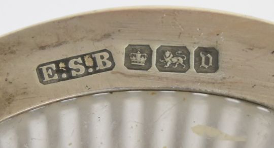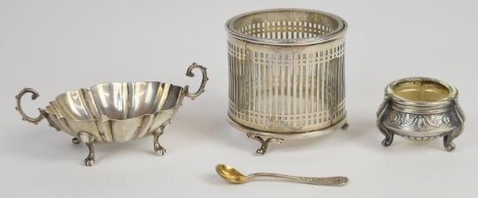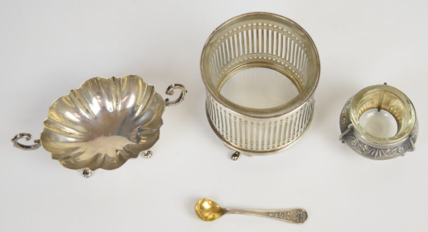 George V hallmarked silver condiment or large salt with pierced decoration and clear glass liner, Sheffield 1913, maker E S Barnsley & Co, height 7cm, hallmarked silver twin handled bon bon or similar dish, raised on four paw feet, London 1913, maker's mark rubbed and a Scandinavian or similar salt with glass liner, weight of first two items without liner 145g