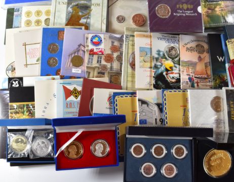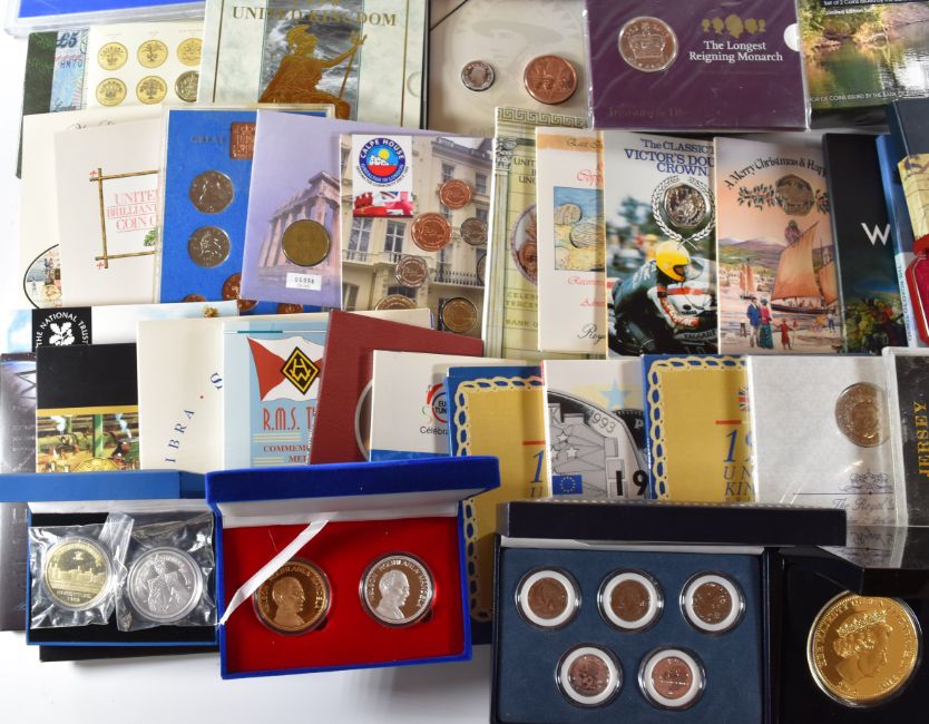 World coin packs, cased coins and similar to include Royal Mint 1977, 1987, 1990 x 2, 1992, 1996 brilliant uncirculated coin sets, 2015 Royal Birth £5, 1948 celebration set including 1008 £5, Millennium £5, 2015 Longest Reigning Monarch £5, 2001 Victorian anniversary crown £5, 1967 coins set, 1995 National Trust centenary medallion, 1989 pair of Bill of Rights £2 coins, 1994 £2, 1972 crown, 1996 five pound coin and note set, 1999 Rugby World Cup £2, Titanic commemorative medal, 2016 WWI £2, 1981 Jersey and Guernsey sets, 1980 Falkland Islands set, 1966 Jersey crown pair, 1964 Jersey set, 1966 Guernsey set, 1978 and 1981 New Zealand sets, 1980 Isle of Man 1980 Olympic four coin set, Gibraltar 2018 set, 1990 New Zealand set
