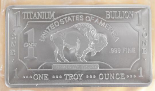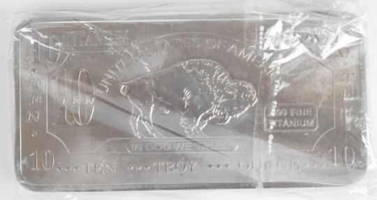 Two United States of America titanium bullion bars comprising ten and one troy ounce examples, length of longer 18cm