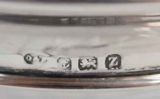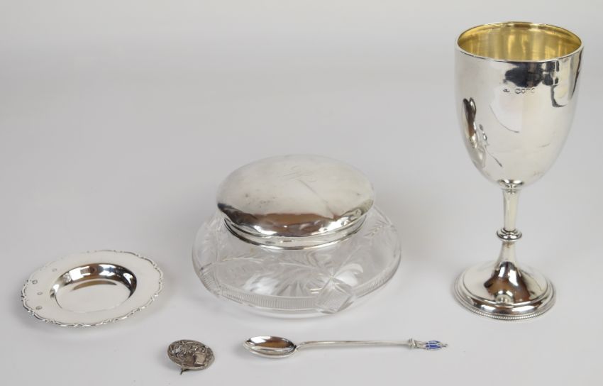 Hallmarked silver items comprising Victorian goblet, height 18.5cm, silver lidded cut glass dressing table pot, feature hallmarked silver dish, souvenir spoon with enamel man finial and a cat brooch marked sterling, weight excluding glass 277g
