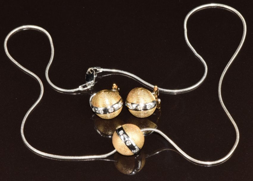 A yellow and white metal pendant and matching earrings set with diamonds on white metal chain (38cm), marked 800, 14.6g