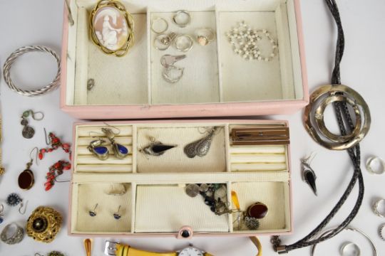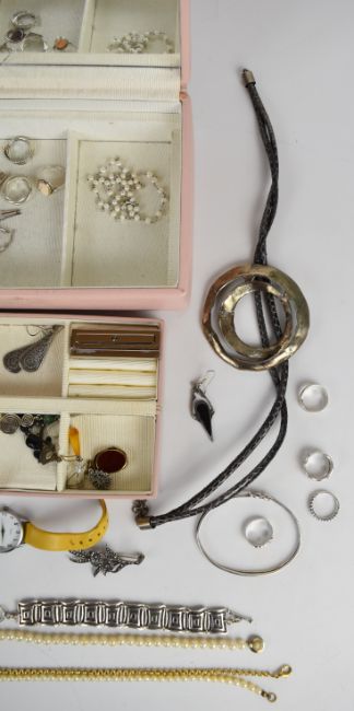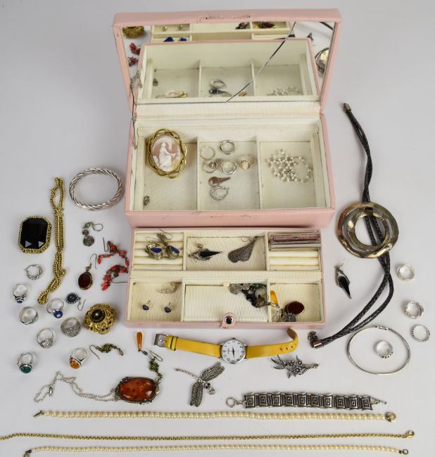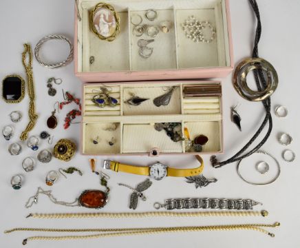 A collection of jewellery including sixteen silver rings, silver earrings, Victorian cameo brooch, two pearl necklaces, amber pendant, silver bangles, silver brooches and costume jewellery, 128g of silver