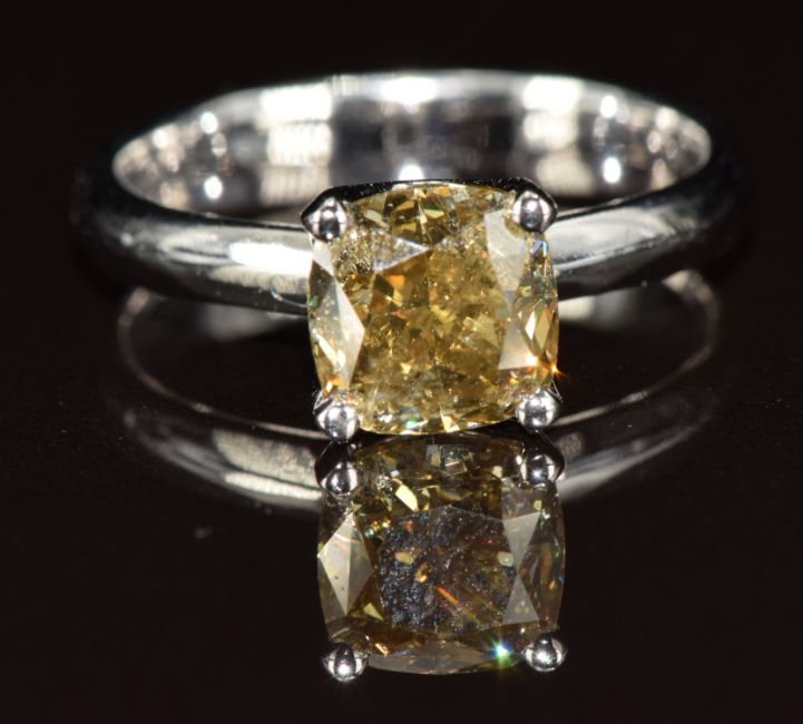 A platinum ring set with a 2.14ct deep yellow/green cushion cut diamond, with certificate, 4g, size N