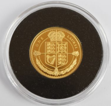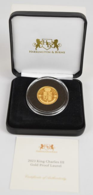 Harrington & Byrne cased limited edition (of 999) 2023 proof gold laurel 22ct Charles III coin, weight 8.00g, with Harrington & Byrne certificate