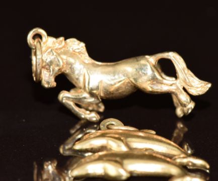 Two 9ct gold charms, one in the form of a horse and the other of two dolphins, 3.2g