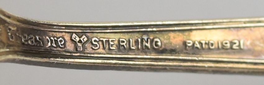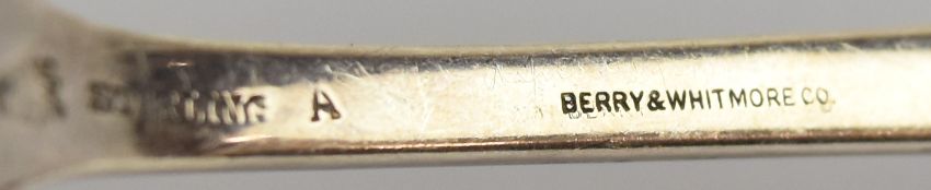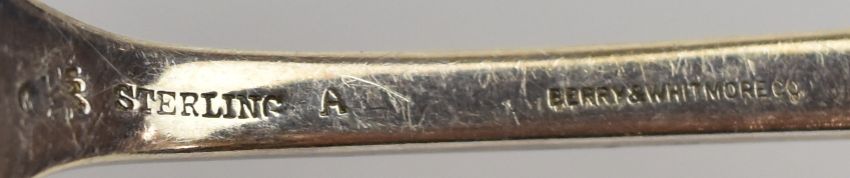 American silver comprising large serving spoon, serving fork, pickle fork or similar, shorter pickle fork, baby's spoon, tea strainer and a pair of sauce ladles, all marked sterling, length of longest 23cm, weight 268g