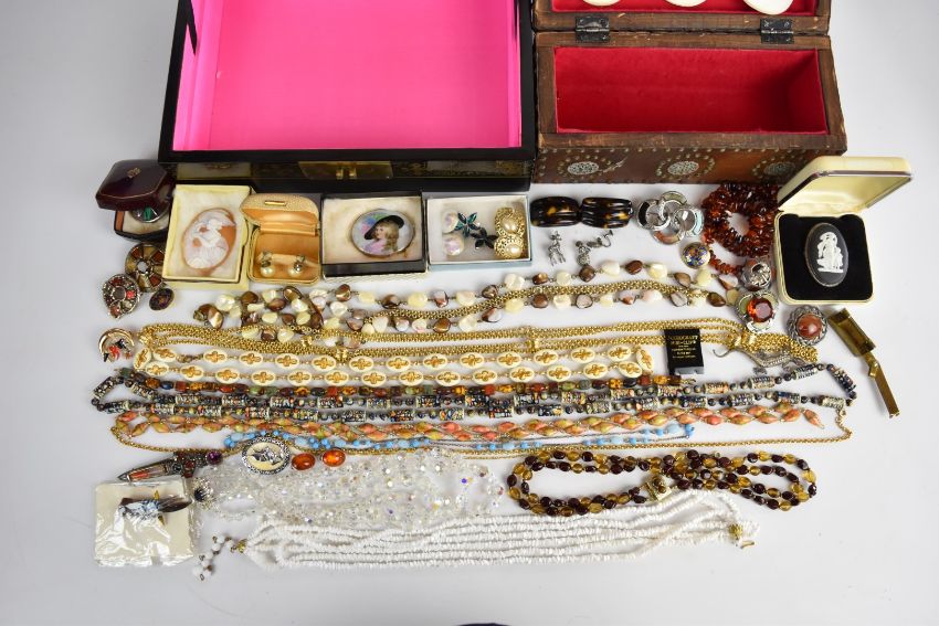 A collection of jewellery including amber necklace, six Miracle brooches, Wedgwood brooch, silver brooch set with agate, cameo, silver lizard brooch, etc