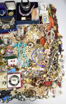 A collection of jewellery including Swarovski ring, Nanagil necklace, agate necklace, vintage earrings, amethyst and pearl necklace, pearl and rose quartz necklace, D'Orlan chain, mother of pearl necklace, malachite necklace, etc