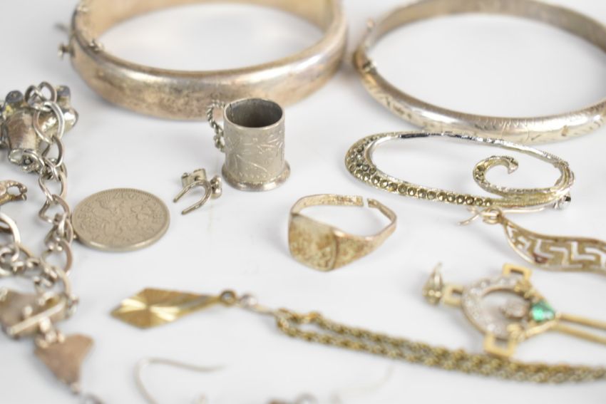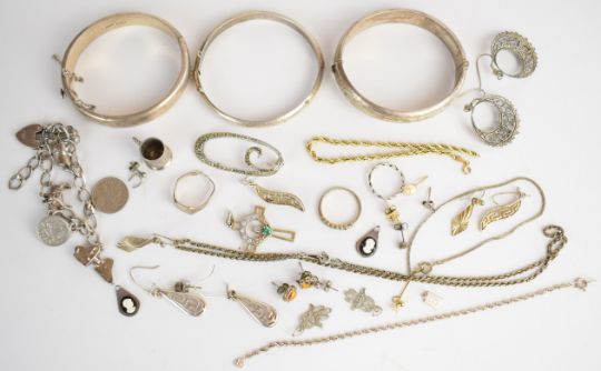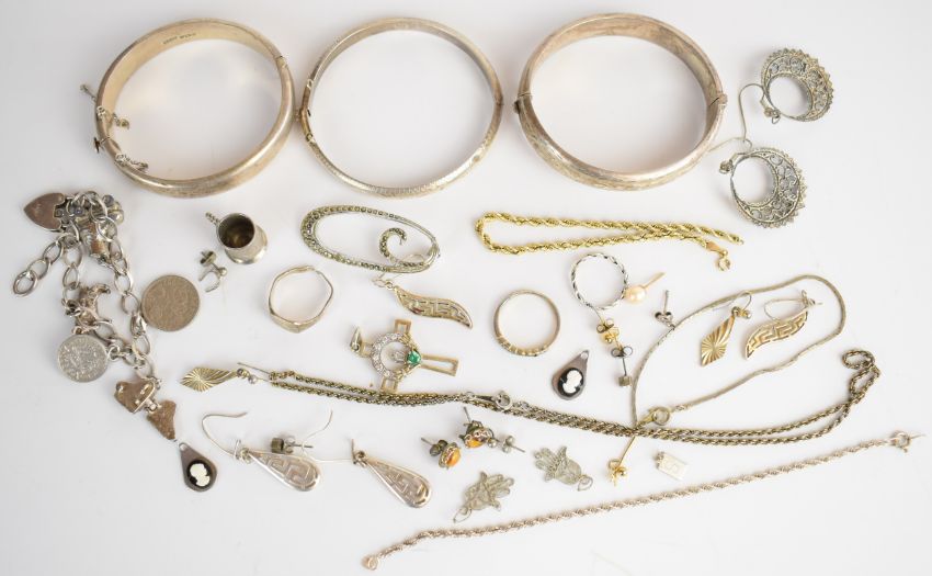 A collection of silver jewellery including three bangles, charm bracelet, two pairs of earrings and damaged 9ct gold rope twist bracelet (1.6g), together with costume jewellery