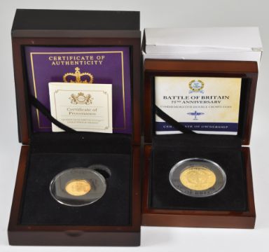 Two cased limited edition proof 4g 9ct gold coins comprising Bradford Exchange 2015 Battle of Britain and 2016 Queen Elizabeth 90th birthday, with certificates