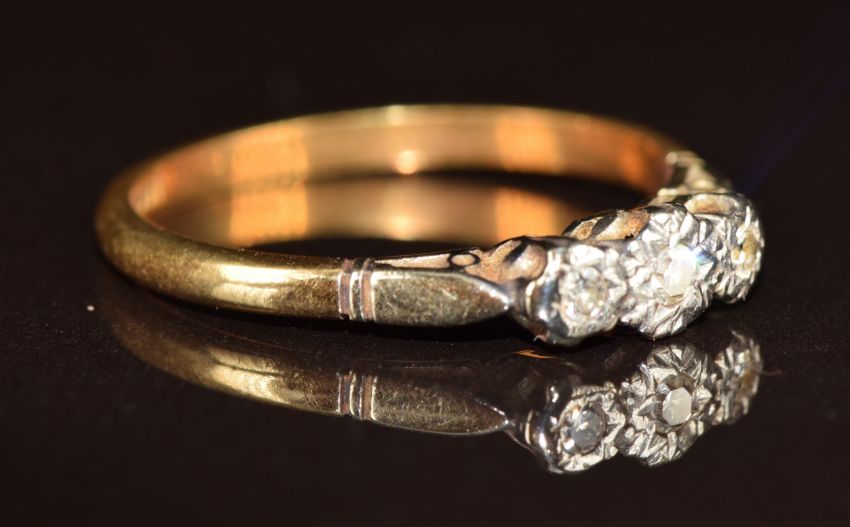 An 18ct gold ring set with three diamonds in a platinum setting, 2.5g, size P