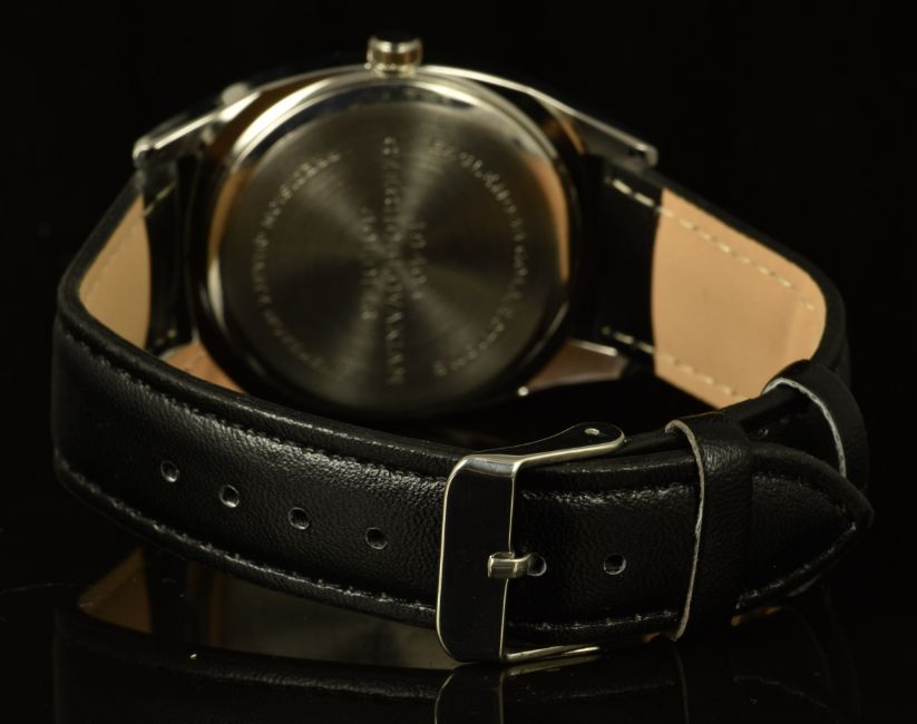 Czechoslovakian Soldier military style gentleman's wristwatch with luminous Arabic numerals, black dial, stainless steel case and quartz movement, on black leather strap, case diameter 37mm.