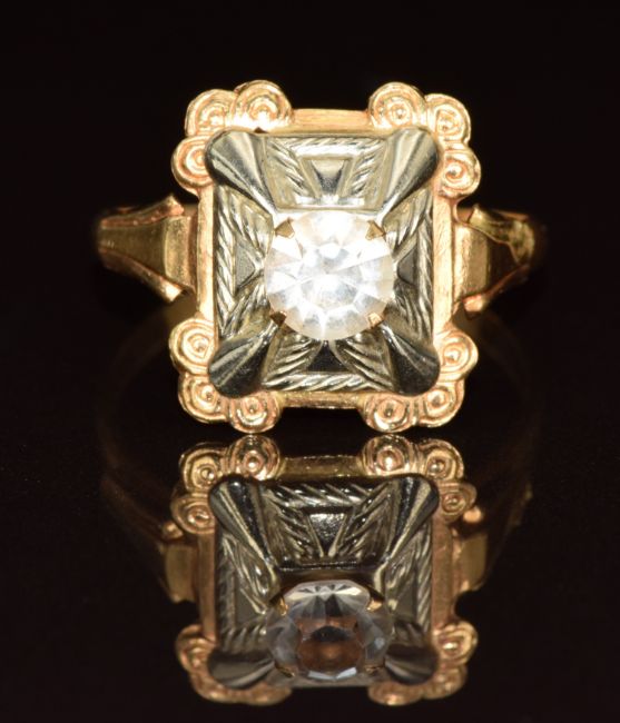 An 18k bi-coloured gold ring set with paste, 3.9g, size R