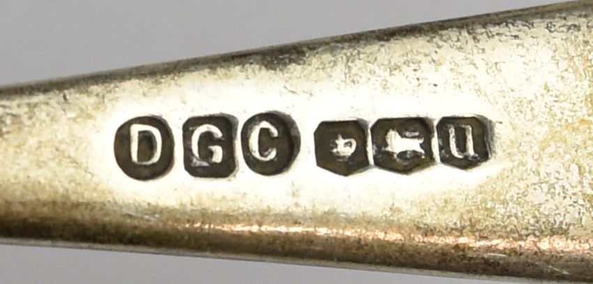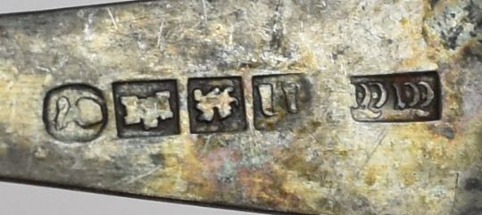 Hallmarked silver spoons including teaspoon with shooting interest finial and mustard and salt spoons, weight 132g, together with a hallmarked silver mounted hand mirror, Walker & Hall hallmarked bread knife or similar blade etc