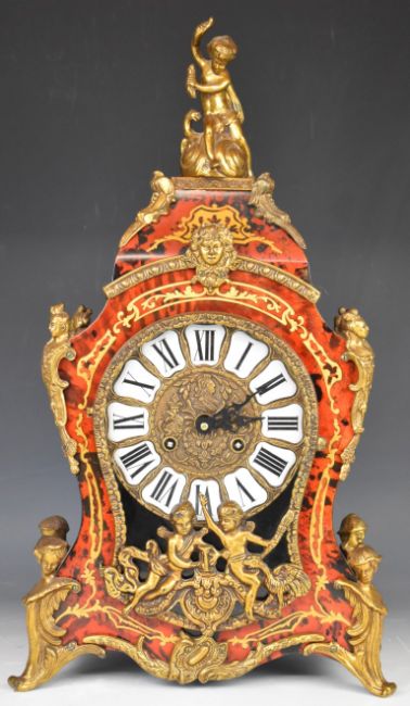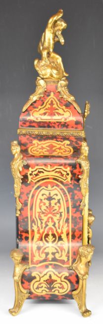 Boulle style bracket clock and wall bracket with brass inlaid decoration and gilt metal mounts, striking on two bells, overall height including bracket 77cm